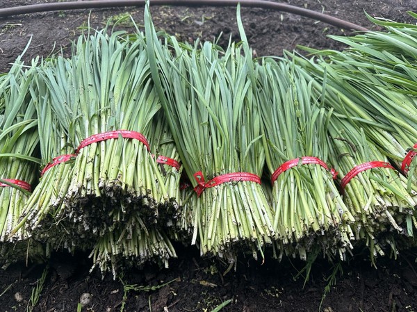 翠绿的韭菜长势喜人,村民们正忙着收割、捆扎。