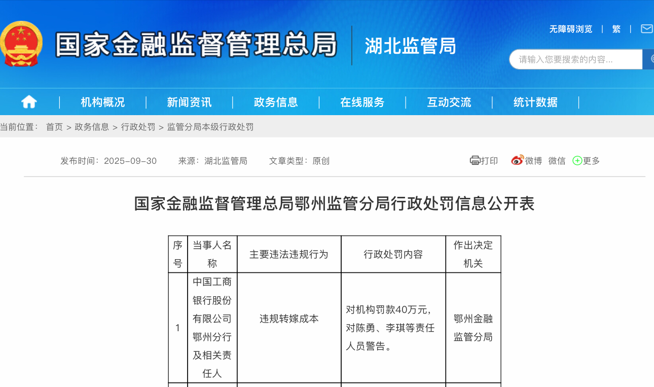 违规转嫁成本 中国工商银行鄂州分行被罚40万元