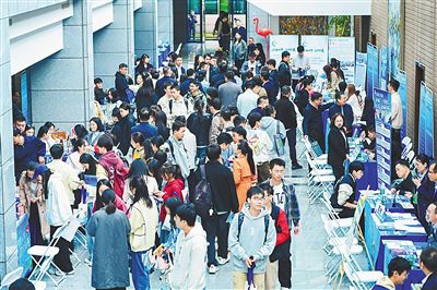 ③在校招活动(杭州站)现场,学生与用人单位面对面交流。
