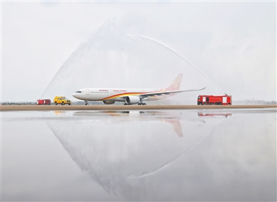当天上午,海南航空在美兰机场举行接机仪式。A330新飞机抵达后,穿越了象征民航最高礼遇的“水门礼”,正式入列海南航空机队。