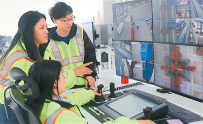 在秘鲁钱凯港,中远海运港口秘鲁钱凯公司员工正进行作业监控。  |