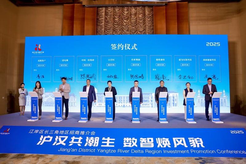 在随后的签约仪式环节中,江岸区分别与10家商协会、校友会,21家知名企业完成签约,项目总金额达97亿元,涵盖城市更新、文化旅游、氢能源、具身智能、大健康、软件信息等多个前沿领域。