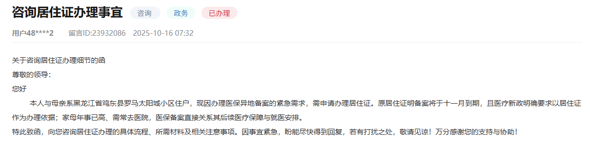 人民网哈尔滨11月9日电 (记者王思迪)户政业务,关乎民生百事。近日,黑龙江网民通过人民网“领导留言板”咨询居住证办理、户口迁移等问题。相关部门积极回应,用专业服务化解“急难愁盼”。