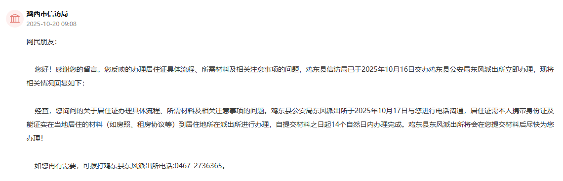 针对该网民反映的问题,鸡西市信访局回复称,鸡东县公安局东风派出所已与该网民进行电话沟通,居住证需本人携带身份证及能证实在当地居住的材料(如房照、租房协议等)到居住地所在派出所进行办理,自提交材料之日起14个自然日内办理完成。