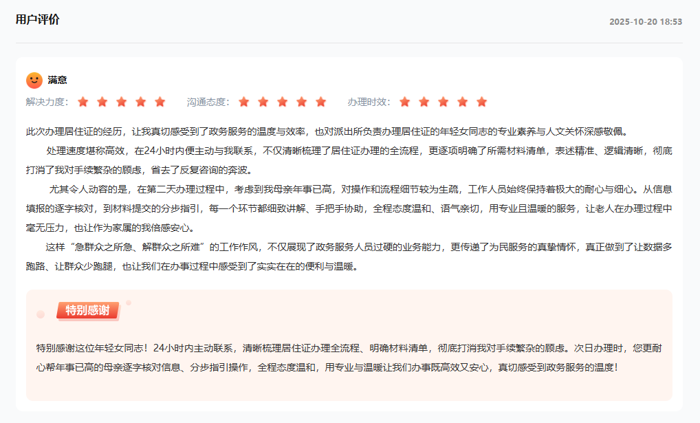 随后,该网民通过人民网“领导留言板”详细描述了证件办理的过程:“此次办理居住证的经历,让我真切感受到了政务服务的温度与效率,也对派出所负责办理居住证的年轻女同志的专业素养与人文关怀深感敬佩。派出所在24小时内便主动与我联系,不仅清晰梳理了居住证办理的全流程,更逐项明确了所需材料清单,表述精准、逻辑清晰,彻底打消了我对手续繁杂的顾虑,省去了反复咨询的奔波。在第二天办理过程中,考虑到我母亲年事已高,对操作和流程细节较为生疏,工作人员始终保持着极大的耐心与细心。从信息填报的逐字核对,到材料提交的分步指引,每一个环节都细致讲解、手把手协助,全程态度温和、语气亲切,用专业且温暖的服务,让老人在办理过程中毫无压力,也让作为家属的我倍感安心。”