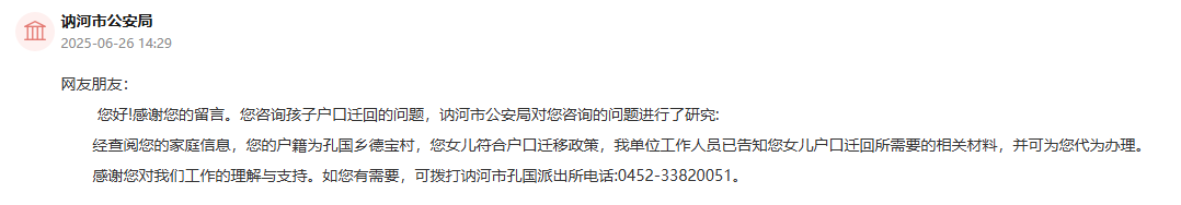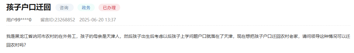除了证件办理,户籍问题也是与群众生活息息相关的民生问题。一位网民留言咨询:“我是讷河市农村在外务工人员,孩子的母亲是天津人,孩子出生后,考虑以后孩子上学问题,户口就落在了天津,现在想把孩子户口迁回农村老家。这种情况可以迁回农村吗?”