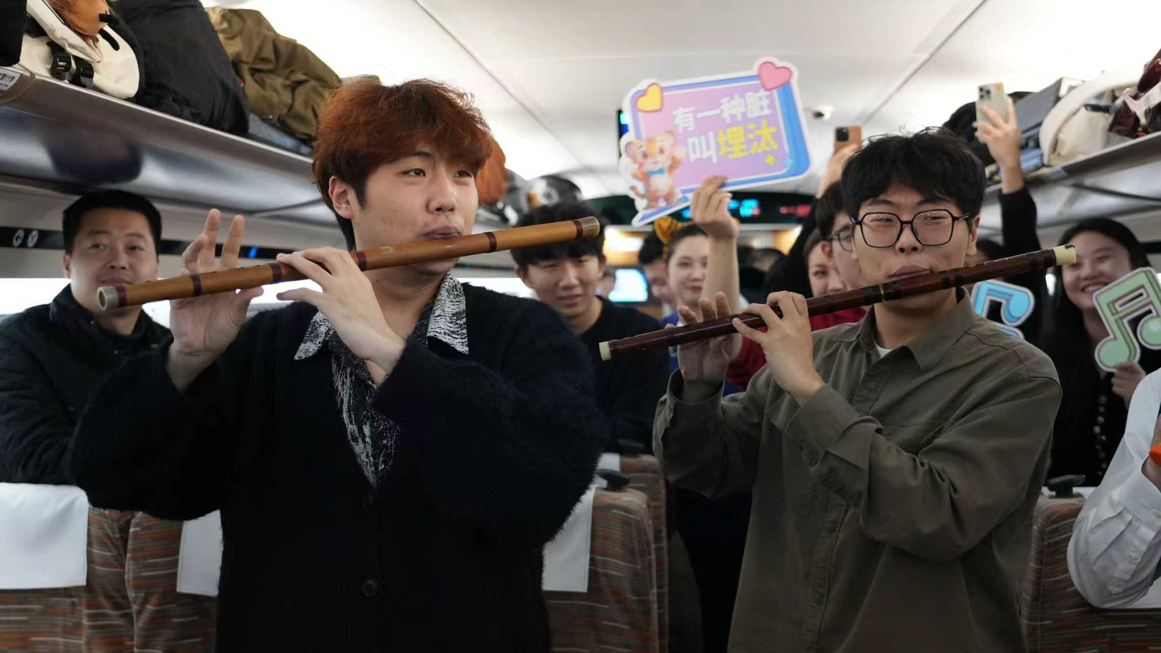 人民网哈尔滨11月20日电 (记者尚城)11月19日,在北京朝阳开往哈尔滨西的G917次动车组列车上,来自哈尔滨音乐学院的青年民族乐团用二胡、笛子、唢呐等民族乐器与列车工作人员共同演绎《我爱你,塞北的雪》等经典曲目,为黑龙江冰雪季增添文化色彩。