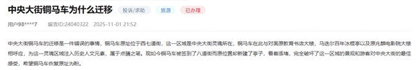 位于哈尔滨中央大街的铜马车雕塑是城市重要文化地标之一,为百年老街增添了浓厚的文化底蕴,展现了哈尔滨作为国际商埠的历史风貌。近日,有网民通过人民网“领导留言板”反映铜马车雕塑被迁移的情况。