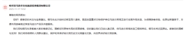 “我们深知铜马车承载着大家的情感记忆,理解您对原有布局的深厚感情,您的建议我们已经认真记录,待马迭尔宾馆改造工程结束后,铜马车将迁回原址。”哈尔滨马迭尔文化旅游投资集团有限公司表示,将持续倾听人民群众建议,保护和传承好哈尔滨历史文化根基与文脉,向世界讲好哈尔滨故事。