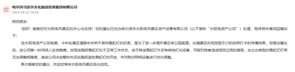 哈尔滨马迭尔文化旅游投资集团有限公司回复称,该建议已交办哈尔滨市太阳岛风景区资产经营有限公司处理,经核查,今年在景区道路中央树干装饰霓虹灯的初衷,是为了进一步提升景区夜公园氛围,加强景区的视觉吸引力和拍照打卡的传播效果。网民提出建议后,该公司第一时间派人实地踏查,发现该路段霓虹灯处于正常工作状态,由于除该霓虹灯外还有其他灯光设备,可能对游客造成视觉过亮的感受,加之此类型的霓虹灯灯带无法调整明暗度,遂该公司决定暂时关闭此路段蓝色霓虹灯的开放,并对附近照明设备进行优化调整。