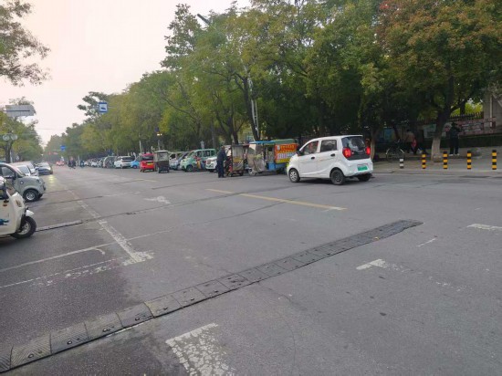 淄博一小学附近,路两边停放着多辆接送孩子的“老头乐”