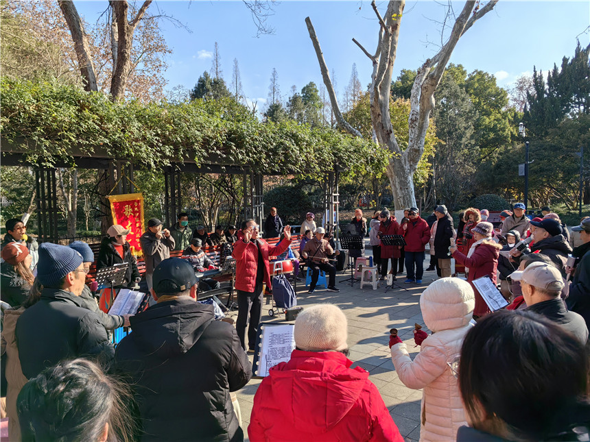 1月2日下午,位于虹口区的鲁迅公园内,冬日暖阳下,老年朋友们齐声唱起《红星歌》《绣红旗》等经典歌曲,欢庆元旦佳节。人民网记者 唐小丽摄