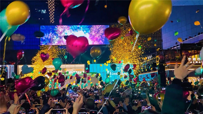 零点时分,五角场万达广场大屏幕下,年轻人仰头注视屏幕上的倒计时数字,齐声呼喊,欢呼声顷刻间填满整个空间,将跨年氛围推向高潮。杨浦区新闻办供图