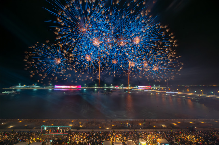 上海新年第一游暨上海国际邮轮旅游度假区跨年迎新系列活动于2025年12月31日晚启幕,吴淞口空中剧场烟花大秀惊艳登场,将跨年夜氛围推向炽热顶点。宝山区新闻办供图