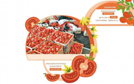 山东寿光市商务局党组成员隋立东介绍,寿光蔬菜价格指数显示,2025年12月中旬,西红柿价格达到9.66元/公斤的高位,12月底开始,西红柿价格陆续回落,截至2026年1月7日中午,西红柿平均价格为6.59元/公斤。