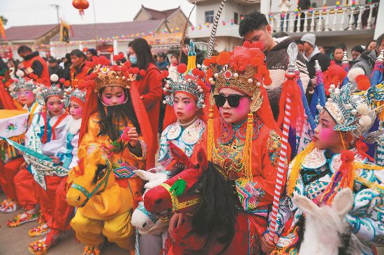 2月3日,宣城市郎溪县新发镇双桥村非遗下阳小马灯展演间隙,孩子们排坐整齐。