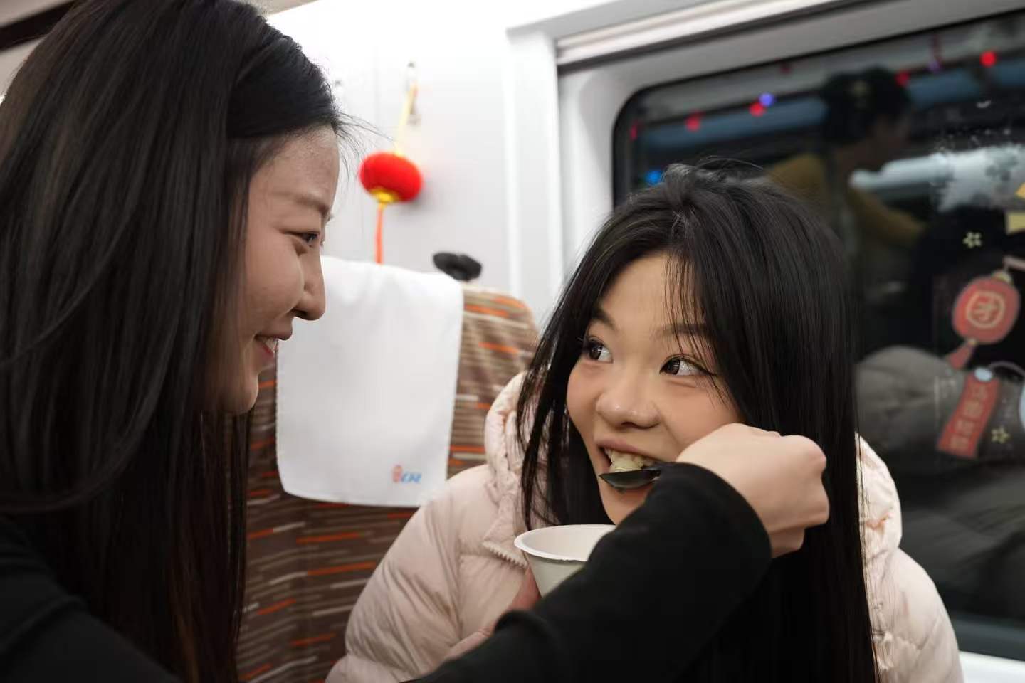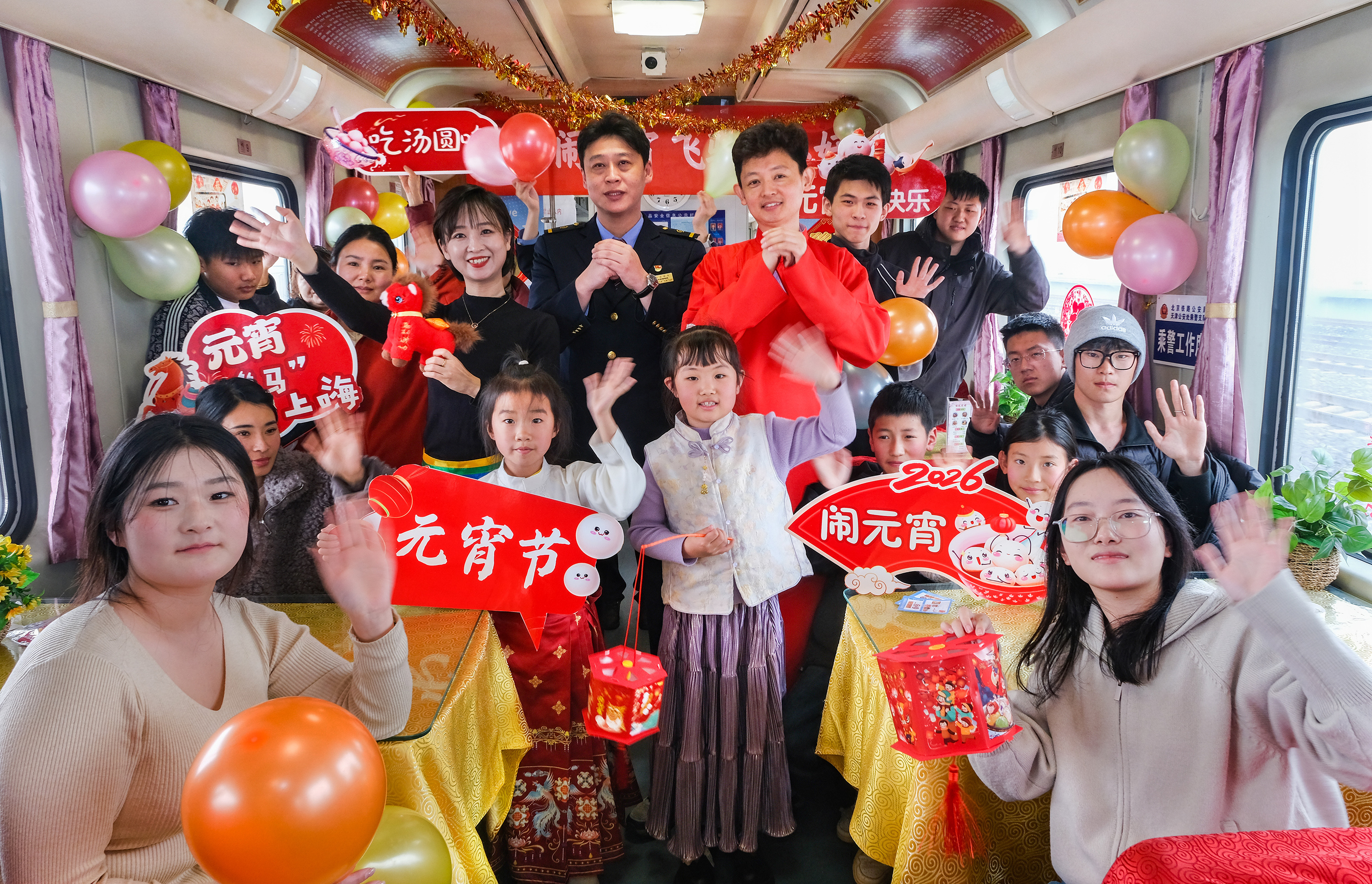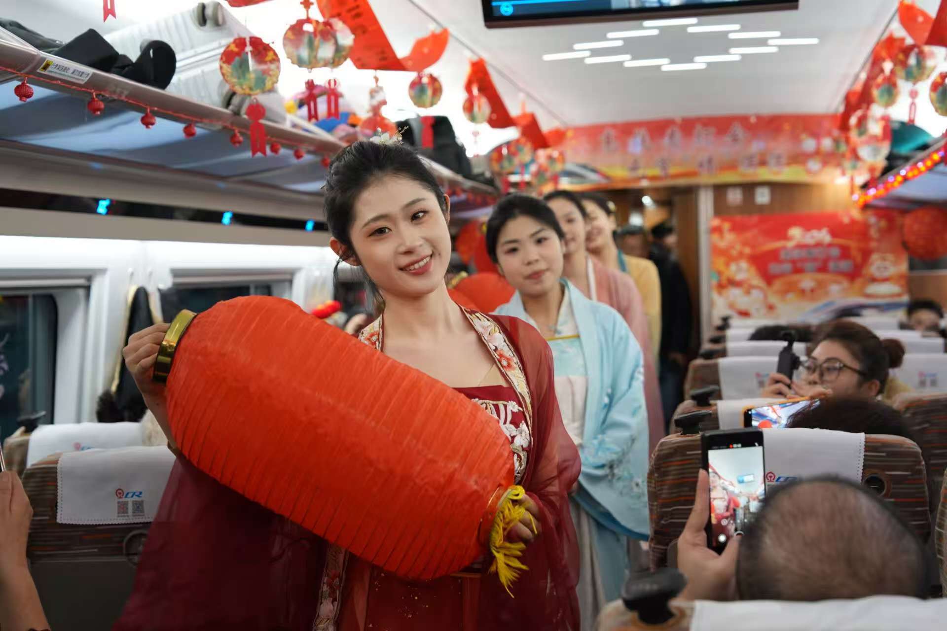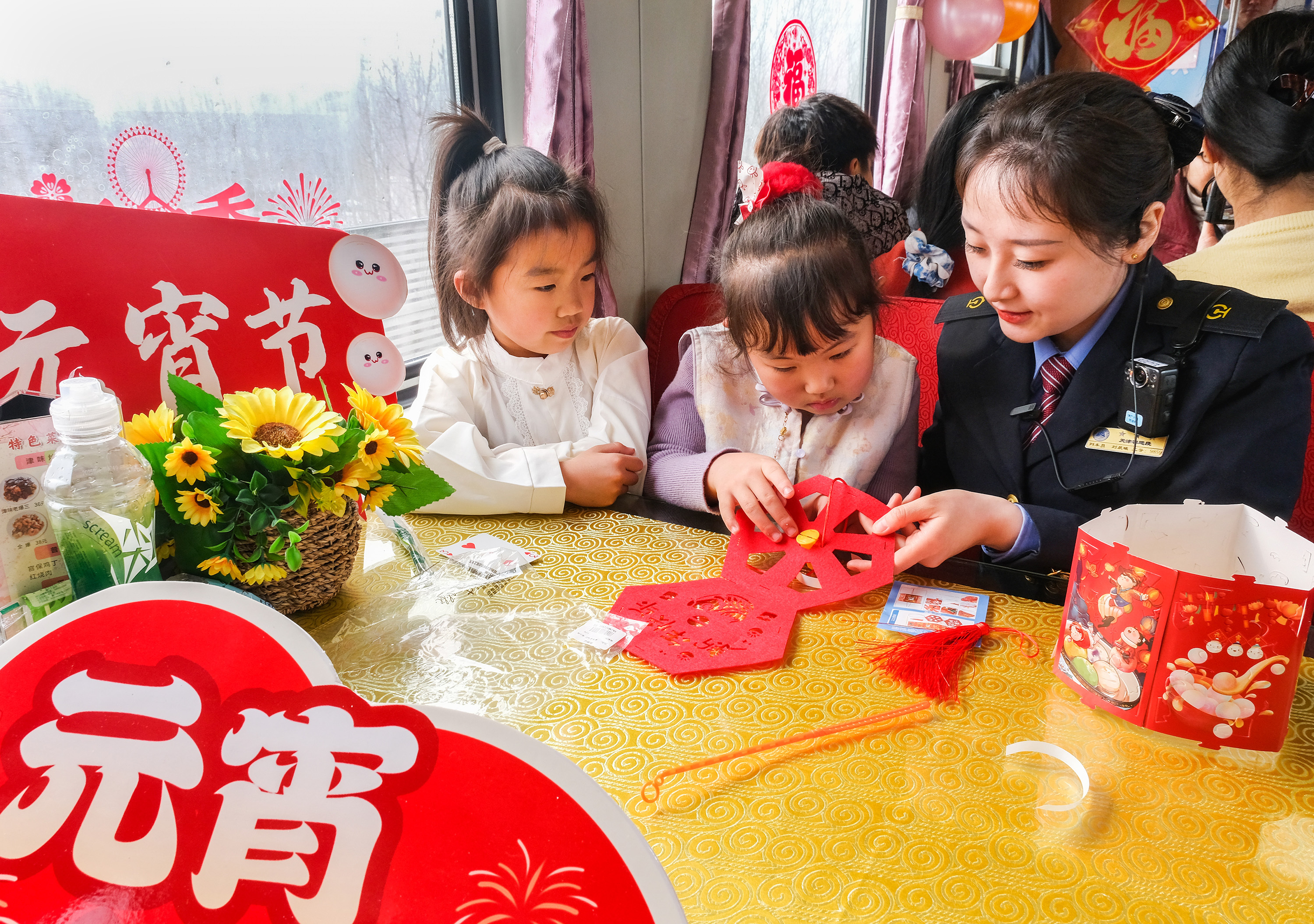 车厢内喜庆的节日装饰暖意浓浓。乘务人员为旅客表演相声、舞蹈等文艺节目,与旅客互动猜灯谜、做花灯、吃元宵,车厢里满是欢笑与温情。