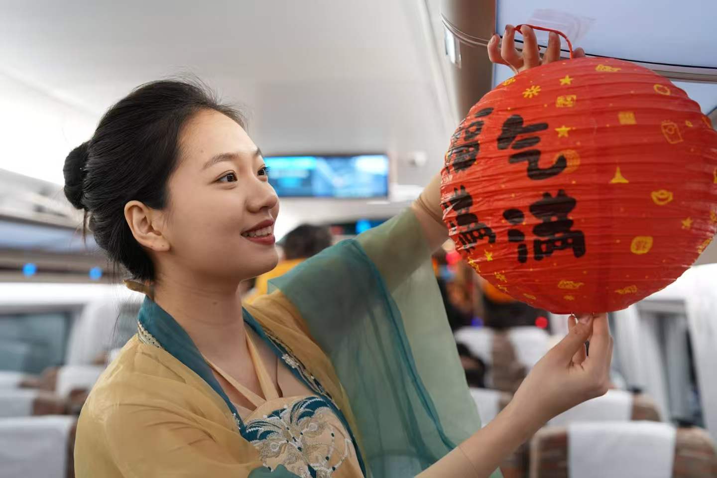 色彩鲜艳的拉花,交相辉映的灯笼,车厢处处洋溢着喜庆祥和的节日气息,旅客刚进入车厢,惊喜地发现仿佛置身移动的“元宵喜乐会”。