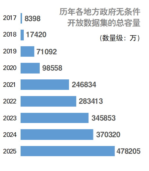 数据容量是指将一个地方平台中可下载的、结构化的、各个时间批次发布的数据集的字段数(列数)乘以条数(行数)后得出的数量,体现的是平台上开放的可下载数据集的数据量和颗粒度。2019年以来,各地平台无条件开放的可下载数据集的容量从2019年的约15亿到2025年超1907亿,六年间增长了126倍,复合年均增长率为124%。