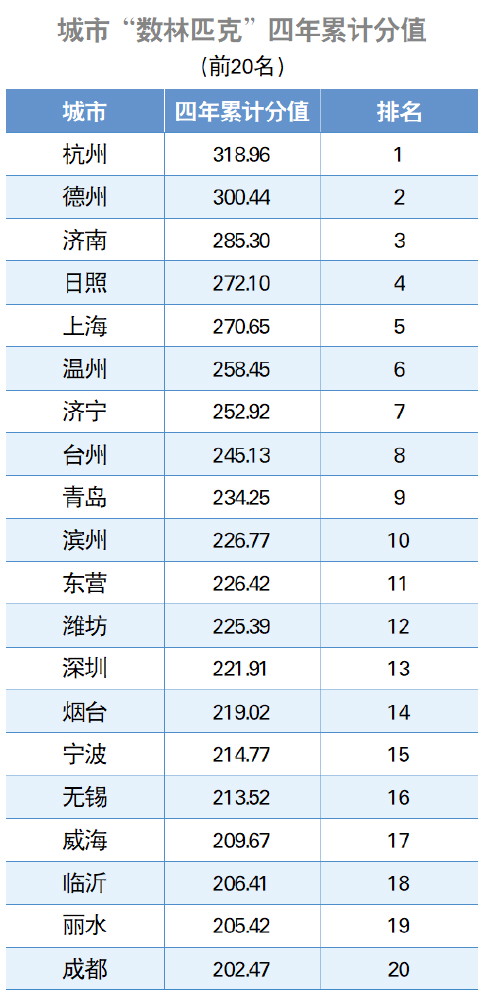 报告进一步通过“数林匹克”累计分值,反映一个地方在过去四年(2022年—2025年)开放数据的持续水平。2022—2025省域“数林匹克”累计分值排在前十名的分别是浙江、山东、贵州、福建、四川、广东、广西、江苏、海南、辽宁等省域。在城市“数林匹克”累计分值前二十名中,杭州、德州、济南、日照、上海位列前五。(戴岳)