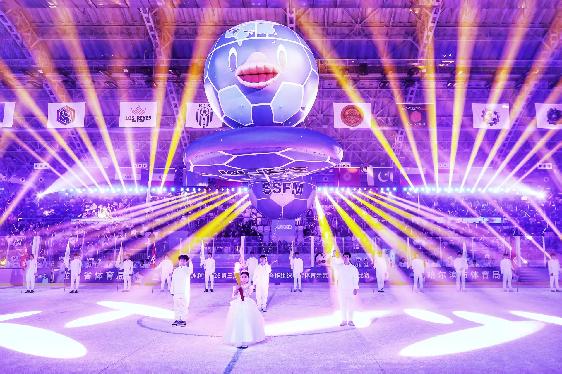 开幕式现场,动感的歌曲与观众的热情互动为赛前烘托出热烈氛围。来自国内外的数千名球迷齐聚冰城,共赴这场冰雪足球盛宴。球迷们挥舞旗帜,高喊整齐划一的口号,呐喊声震耳欲聋,将现场气氛烘托得火热非凡。