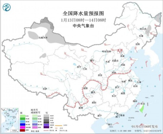 图2 全国降水量预报图(1月12日08时-13日08时)。图片来源:中央气象台网站