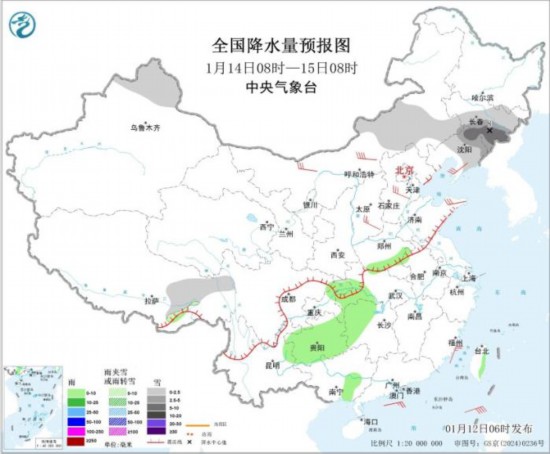 图4 全国降水量预报图(1月14日08时-15日08时)。图片来源:中央气象台网站