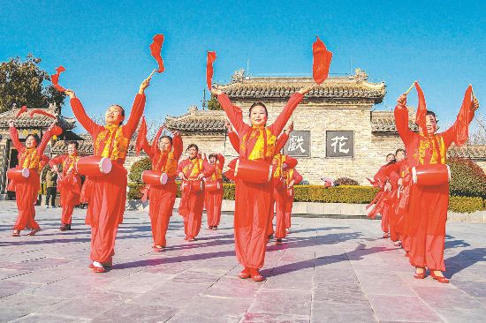 1月8日,亳州市谯城区花戏楼广场,人们在练习打腰鼓,共享运动带来的快乐。通讯员 张刘艳 摄