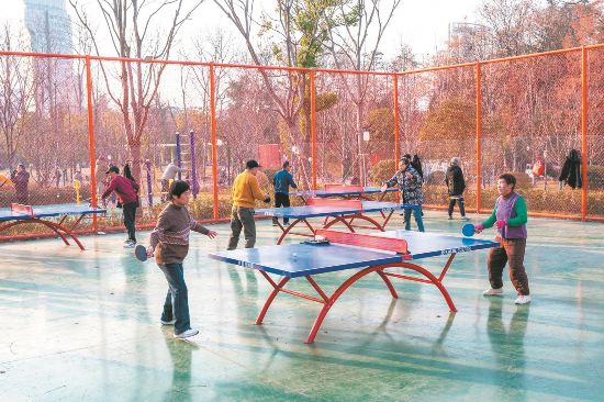 1月8日,在芜湖市镜湖区大砻坊街道北门口社区,市民在九莲塘公园里打乒乓球。原芜湖市缝纫机厂地块升级改造为九莲塘公园,成为居民家门口的锻炼好去处。通讯员 肖本祥 摄