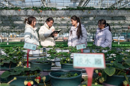 1月13日,在长丰县智慧农业谷数字草莓示范园,安徽工商职业学院社会实践团队的大学生实地查看不同种类草莓生长情况。当日,该校大学生走进长丰县开展寒假社会实践活动,近距离了解长丰草莓从品种选育、科学种植到品牌销售的全产业链发展模式,并运用专业知识通过网络推介长丰草莓。