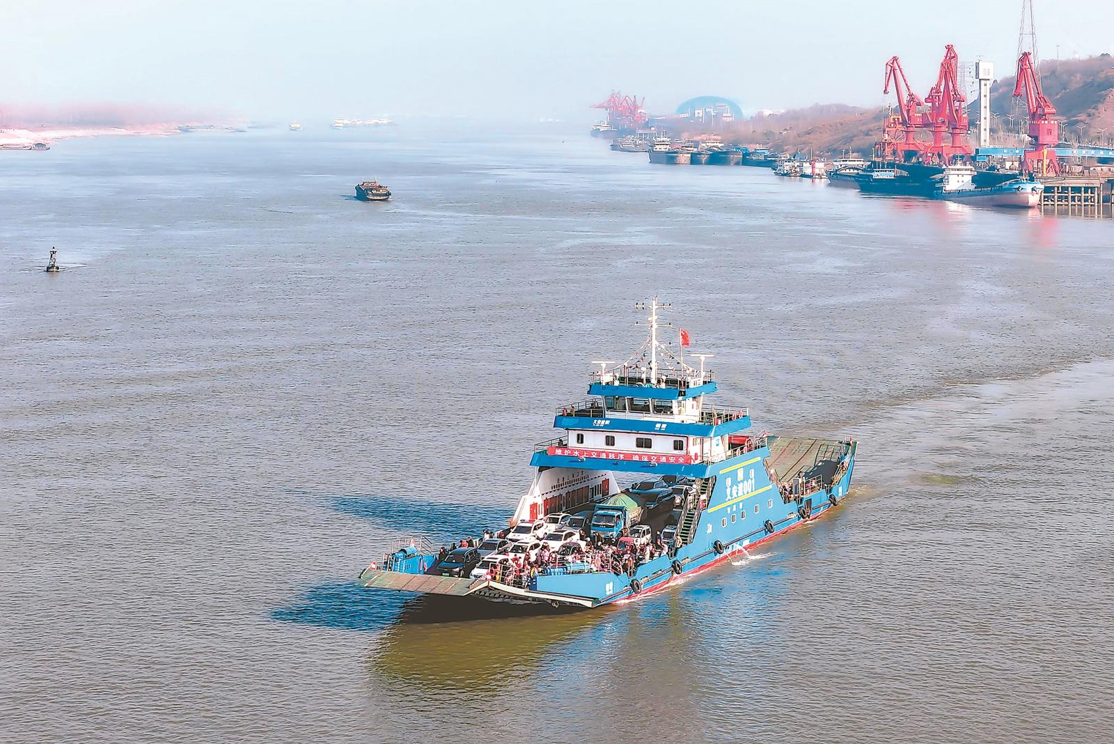 2月3日,乘客和车辆搭乘轮渡前往位于长江江心洲的铜陵市义安区老洲乡。春运期间,当地政府积极调整渡船运行时间和频率,加强渡运安全管理,保障水上春运交通安全。