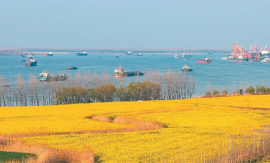 近日,芜湖市繁昌区荻港镇段长江岸线,金黄的油菜花田与行驶在航道上的船只相映成景,构成一幅美丽的生态画卷。 本报通讯员 肖本祥 摄
