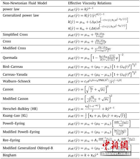 据介绍,该研究确立了血液非牛顿特性的科学分界点。在该数值之上,血液的黏稠度基本稳定,就像水一样(可视为普通牛顿流体);而在此之下(如动脉瘤、血管狭窄区域),血液就表现出明显的“非牛顿”特性,黏稠度会变化,红细胞更容易聚集。研究系统梳理了包括幂律模型、广义幂律模型、Cross及其修正模型、Bird-Carreau模型、Carreau-Yasuda模型、Quemada模型等模型在内的目前主流的非牛顿流体模型的剪切率适用范围。