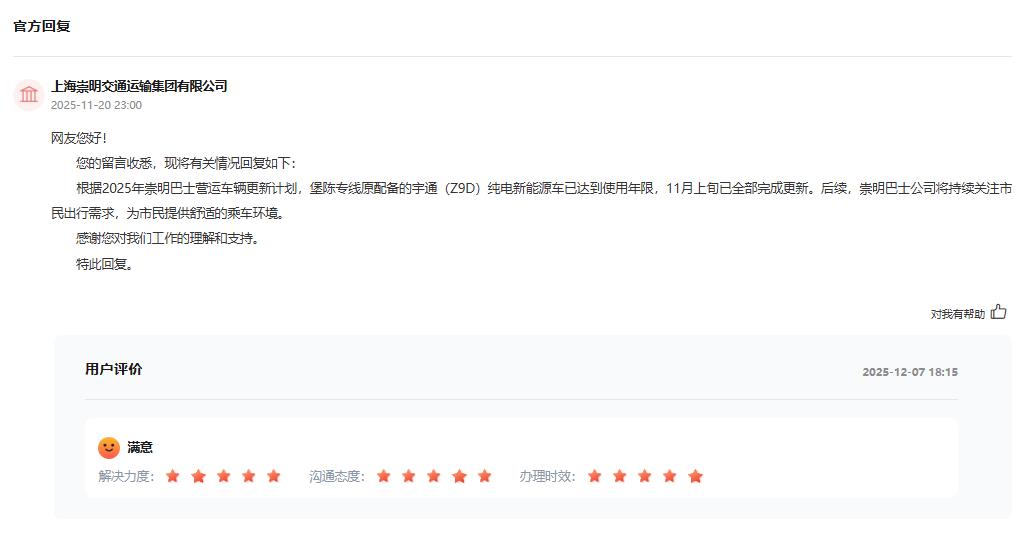 上海崇明巴士公交有限公司迅速核查并回应:根据2025年崇明巴士营运车辆更新计划,堡陈专线原配备的车辆已达到使用年限,11月上旬已全部完成更新。