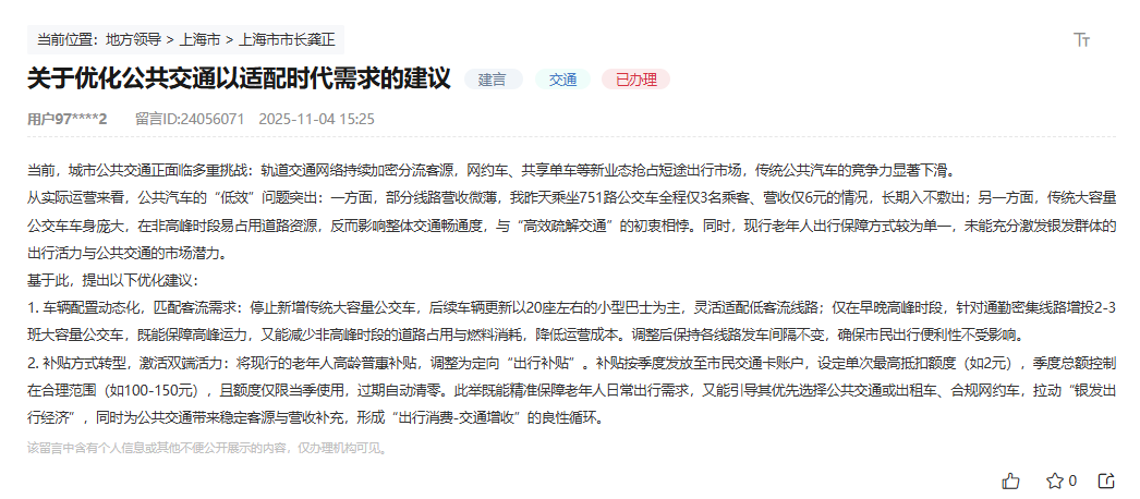 该网友指出,当前公交面临客流结构变化、效率有待提升等挑战,并提出“大小车动态调配”“老年人补贴转型为定向出行激励”等建议。