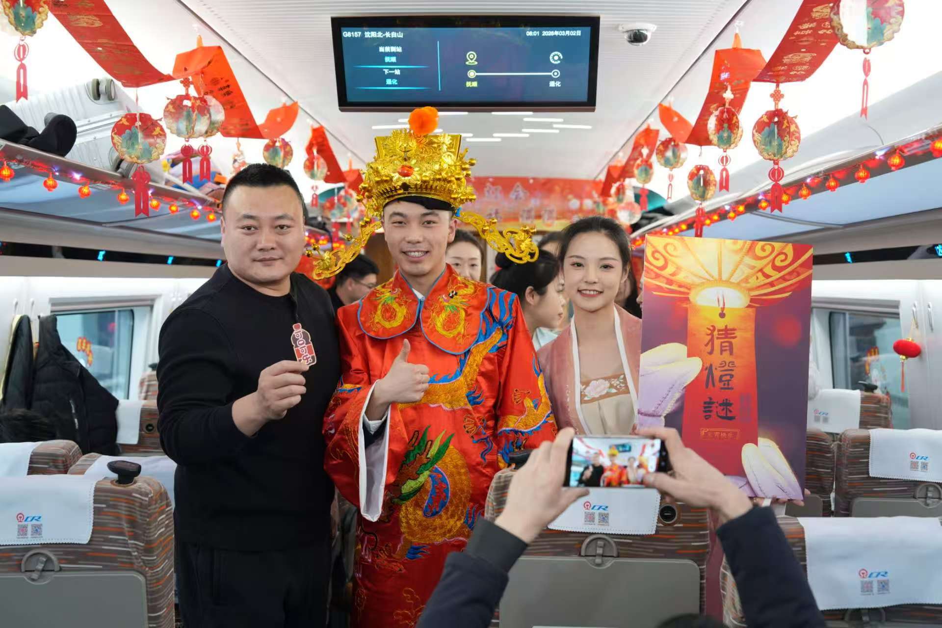 在G8157次列车上,一场“高铁看灯会 元宵福满满”元宵节特色活动也正在上演,国铁沈阳局沈阳客运段动车一队的乘务人员与旅客欢聚一堂,用欢声笑语编织出一段温馨难忘的旅途记忆。