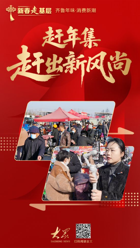 非遗也进了大集。在新泰的黄河大集上,朱氏五彩火笔烙艺、泰山刺绣、剪纸、刘氏陶艺等非遗摊位吸引了不少孩童。“这是妈妈小时候过年玩的。”家长们扫码付款,买走的不只是手工艺品,更是一种回忆。现场还有舞龙、独杆跷、“百兽图”等表演,群众在赶大集、办年货的同时,享受了一场“年味文化大餐”。