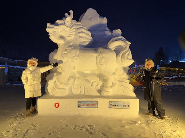 走进雪雕区,多组雪雕作品在雪乡银装素裹的背景下熠熠生辉,吸引着八方来客驻足欣赏、拍照留念。这些雪雕作品不仅营造出浓厚的文化氛围,更以其吉祥的寓意和精湛的工艺,传递出美好的诚挚祝愿。